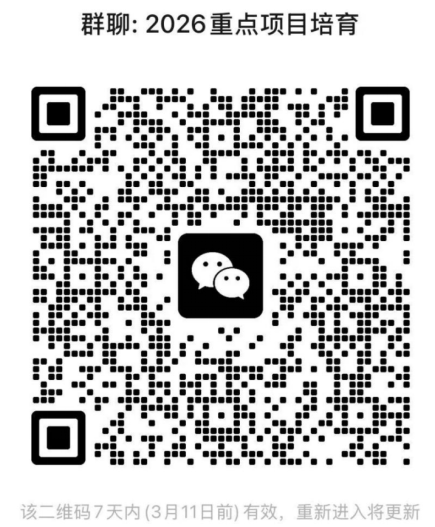 请各学院指导推荐项目填写《重点培育项目申报表》(见附件1),并对推荐项目进行排序。将《学院重点培育项目推荐汇总表》(见附件2)、《重点培育项目申报表》、项目展示PPT(需包括项目背景、产品或服务、核心技术、知识产权、获奖、落地情况或运用案例)电子版汇总,以“学院+重点培育项目”命名,于2026年3月11日16:30前统一发送至创新创业学院邮箱czdcxcyxy@163.com。请申报人员(项目负责人)扫码进群,相关通知会在群里发布。